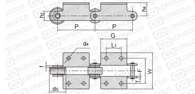 此種輸送鏈?zhǔn)怯呻p節(jié)距鏈條衍生而來的,鏈條節(jié)距為非常用規(guī)格,通過裝備標(biāo)準(zhǔn)附件或非標(biāo)附件使鏈條滿足特定的工作需求。