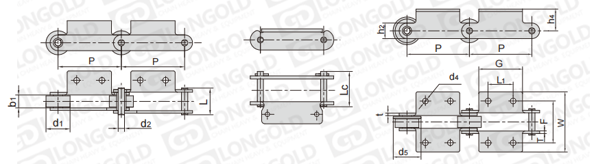 此種輸送鏈?zhǔn)怯呻p節(jié)距鏈條衍生而來(lái)的,鏈條節(jié)距為非常用規(guī)格,通過(guò)裝備標(biāo)準(zhǔn)附件或非標(biāo)附件使鏈條滿足特定的工作需求。