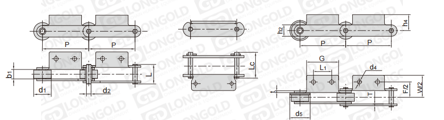 此種輸送鏈?zhǔn)怯呻p節(jié)距鏈條衍生而來(lái)的,鏈條節(jié)距為非常用規(guī)格,通過(guò)裝備標(biāo)準(zhǔn)附件或非標(biāo)附件使鏈條滿足特定的工作需求。