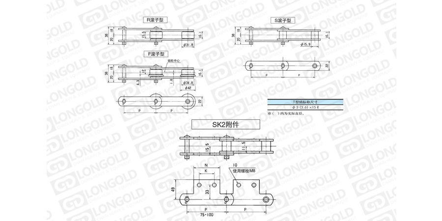 在大型輸送鏈條的兩側(cè)加裝直立翼板板附件的鏈條。附件是為了將夾具安裝在鏈條上的零部件,可根據(jù)客戶要求設(shè)定安裝間隔。附件上帶有2個孔,附件表示為:SK2。
