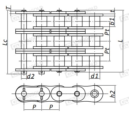 鏈條的鏈板形狀與SP系列高強(qiáng)度滾子鏈相同,鏈板厚度加厚,為A系列對(duì)應(yīng)的下一級(jí)較大節(jié)距鏈條的鏈板厚度。