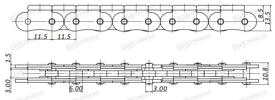 隆德防彎鏈條是安裝在鏈?zhǔn)介_(kāi)窗機(jī)內(nèi),用來(lái)推拉窗戶(hù)的特殊傳動(dòng)鏈條。一般選用不銹鋼材質(zhì)制造,也可以根據(jù)客戶(hù)要求用碳鋼表面做鍍鎳、鍍鋅、鍍鉻和達(dá)克羅等防護(hù)處理。