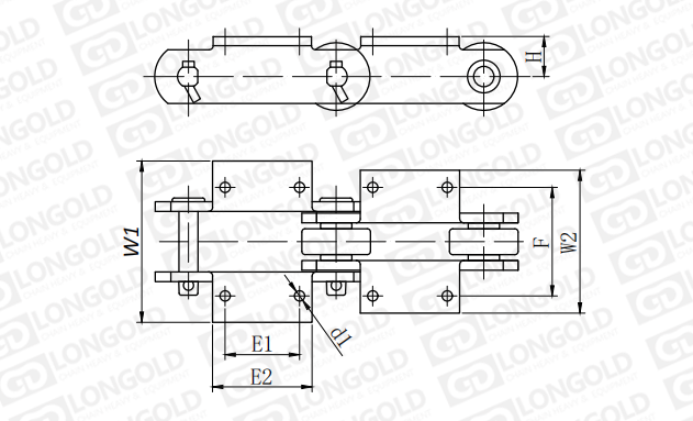 鏈板為直板型,帶K2附件,即兩側(cè)帶折彎板,折彎板上帶兩個孔。