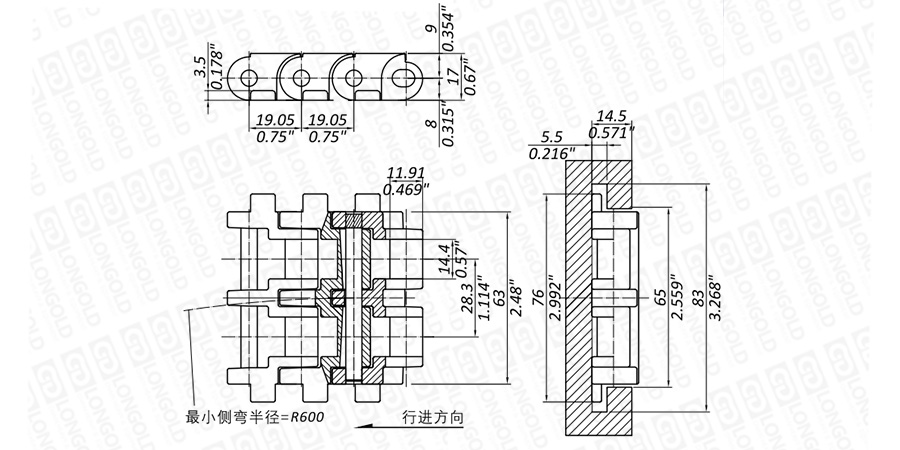 上圖為L(zhǎng)SP-UPO12-2系列轉(zhuǎn)彎鏈的結(jié)構(gòu)圖,圖紙已標(biāo)明本體尺寸。