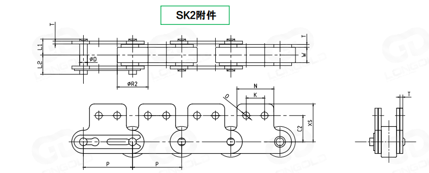 采用特殊工程塑料滾子,與工程塑料制滾子相比,噪音更低。本體為鋼制的雙倍節(jié)距鏈條,在套筒和滾子之間可無加油使用。實(shí)現(xiàn)了輕量化和低噪音化。根據(jù)不同的使用要求,本體鏈條可制成通用規(guī)格,NP規(guī)格和SS規(guī)格。鏈條兩側(cè)鏈板向上延伸作為附件,附板上帶有一個或者兩個螺孔,附件表示為:SK1和SK2。