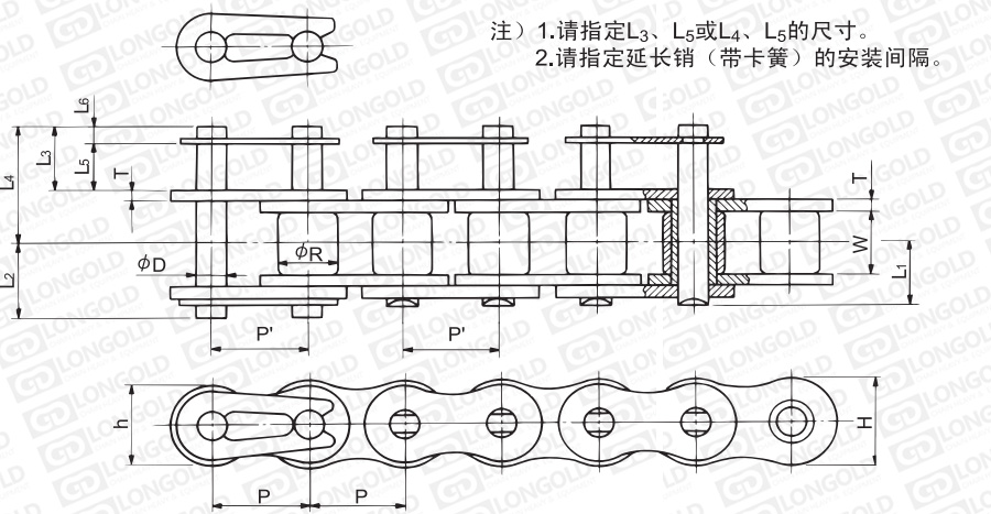 鏈條的一側銷軸延長的,且延長銷軸的末端帶有卡簧槽,利用卡簧安裝夾具等。附件表示為:EC。