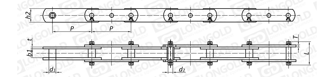鏈條兩側(cè)帶側(cè)滾輪,其結(jié)構(gòu)類似于側(cè)置滾子鏈條,鏈板上帶有孔,用于人造板材設(shè)備輸送線。