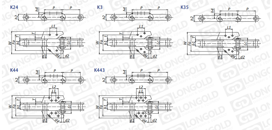鏈條雙側(cè)都帶附板的形式,附板的形式與通常的K附件形式有所區(qū)別,具體附板的形式根據(jù)工作條件與需求決定。