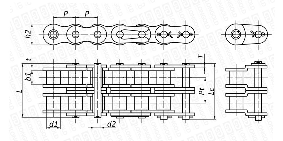 上圖為雙排不銹鋼短節(jié)距A系列滾子鏈本體的結(jié)構(gòu)圖。