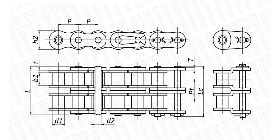 上圖為雙排不銹鋼短節(jié)距B系列滾子鏈本體的結(jié)構(gòu)圖。