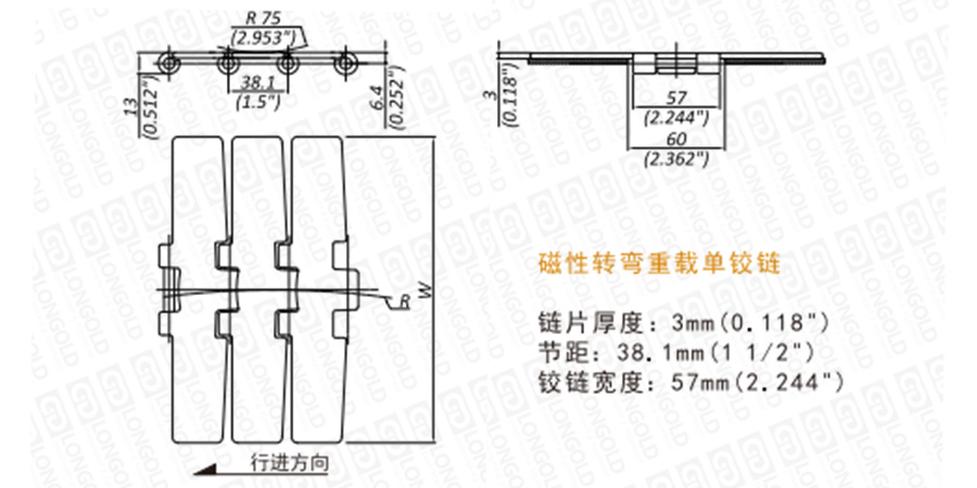 鉸鏈加寬(57毫米),為重型單鉸鏈,銷軸硬度加強(qiáng),增強(qiáng)了鏈條的抗拉伸性。為磁性頂板鏈,型號表示中“M”表示磁性。