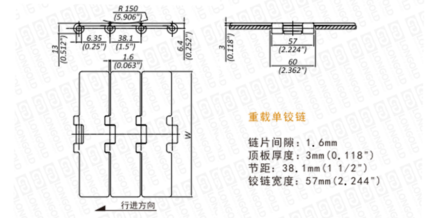 鉸鏈加寬(57毫米),為重型單鉸鏈。HD系列表示銷軸硬度加強,增強了鏈條的抗拉伸性。