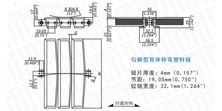 雙體鏈便于更換塑料節(jié),高機(jī)械強(qiáng)度,同單體鏈相比,即便是在負(fù)載條件下頻繁啟動(dòng)同樣可以長(zhǎng)距離傳送并減小拉伸。1863T系列為勾腳型雙體轉(zhuǎn)彎塑料鏈條,鏈條節(jié)距為19.05毫米。 相對(duì)于1843T系列,1863T系列鏈條的鏈片間距縮短。