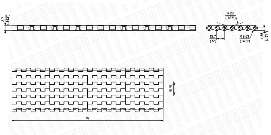 上圖為1/2"節(jié)距網(wǎng)帶與鏈板 300系列的結構圖,圖紙中已標明部分尺寸。