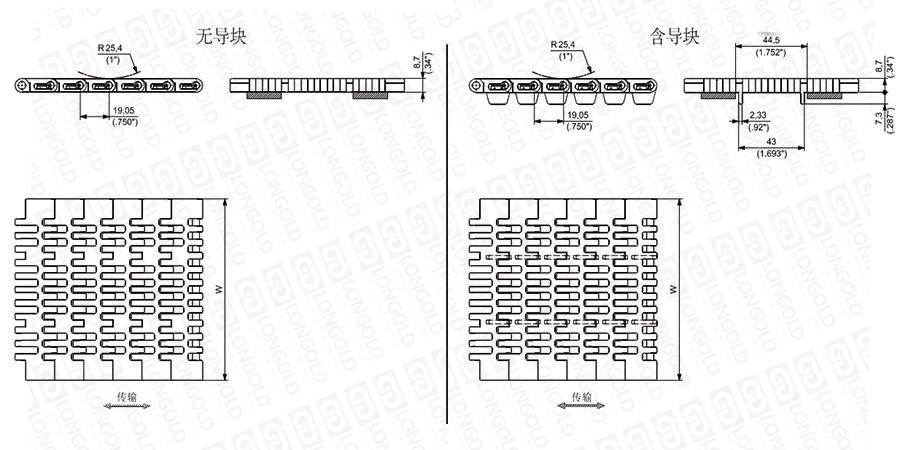 網(wǎng)帶可與磁性或勾腳型鏈板782或783系列并排使用,實現(xiàn)產(chǎn)品在直行與轉(zhuǎn)彎輸送中的順暢過渡。