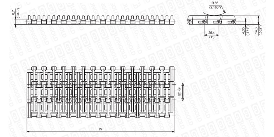 上圖為1"節(jié)距輕載網帶與鏈板 RR 1500系列的結構圖,圖紙中已標明部分尺寸。