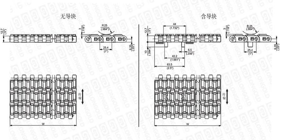 上圖為1"節(jié)距重載網(wǎng)帶與鏈板 HF USPM系列,圖紙中已標(biāo)明部分尺寸。