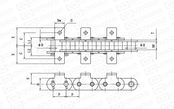鏈條本體為雙倍節(jié)距鏈條,因此更適合用于對(duì)鏈條工作要求更加嚴(yán)苛的場(chǎng)合,同時(shí)鏈條帶K1附件,用以安裝特定部件來(lái)滿足工作條件。