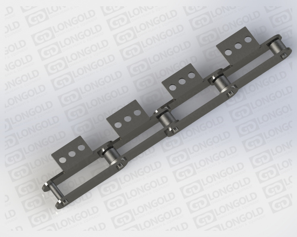 在08125·08150米制節(jié)距大型輸送鏈條的單側(cè)加裝折彎板附件的鏈條。附件是為了將夾具安裝在鏈條上的零部件,可根據(jù)客戶要求設(shè)定安裝間隔。附件上帶有1個或者2個或者3個孔,附件表示為:A1、A2、A3。