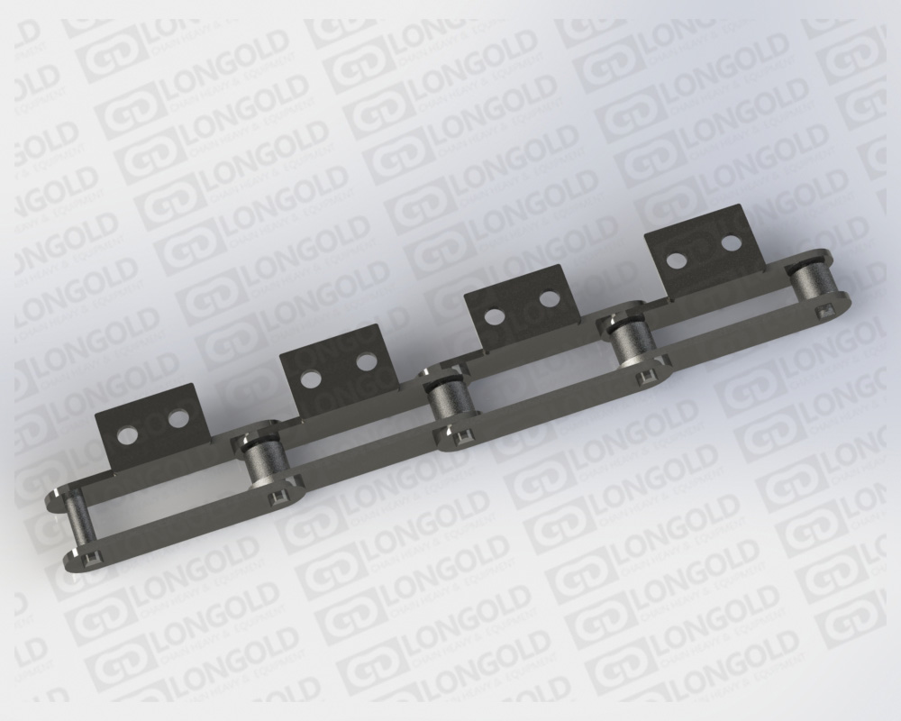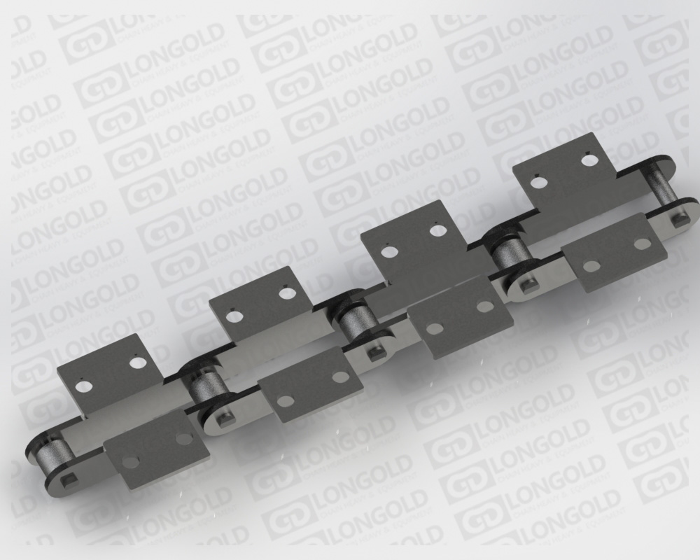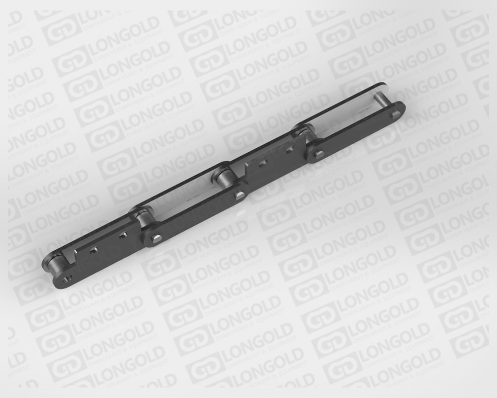 在10100~10150米制節(jié)距大型輸送鏈條的單側(cè)特殊形狀和開(kāi)孔的鏈條。附件是為了將夾具安裝在鏈條上的零部件,可根據(jù)客戶要求設(shè)定安裝間隔。單側(cè)鏈板上帶有螺孔,附件表示為:GA2、GA4。