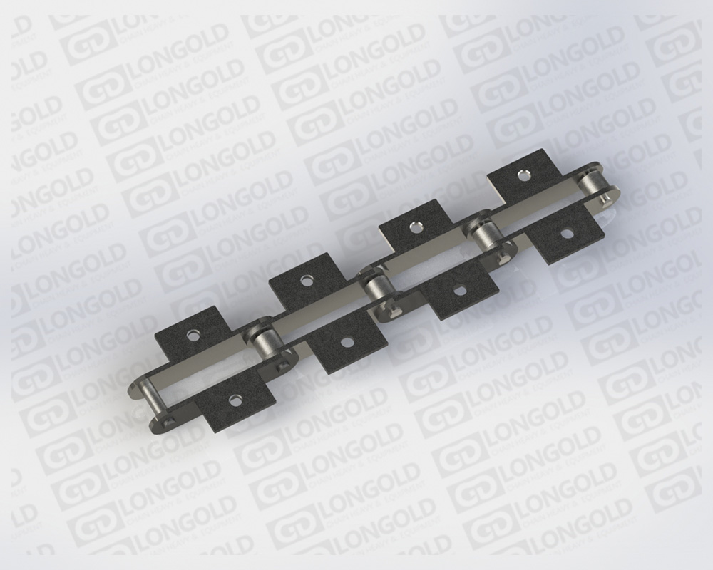 在10100·10125·101500米制節(jié)距大型輸送鏈條的兩側(cè)帶直立翼板附件的鏈條。附件上帶有2個(gè)螺孔,附件表示為:SK2。附件是為了將夾具安裝在鏈條上的零部件,每個(gè)鏈節(jié)帶1個(gè)附件。