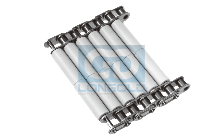 無托盤、可直接承載的自流式鏈條。塑料滾子安裝在鏈條的節(jié)線上,即使在彎曲時(shí)塑料滾子的間隔也保持不變。