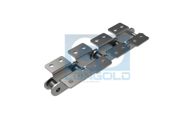 將普通A類滾子鏈的節(jié)距翻倍、鏈板采用平板的帶附件輸送鏈。在鏈條的單側(cè)加裝折彎板附件,附件板上有1個(gè)或者2個(gè)螺孔,附件表示為:A1或者A2,且螺孔的大小是特殊定制。