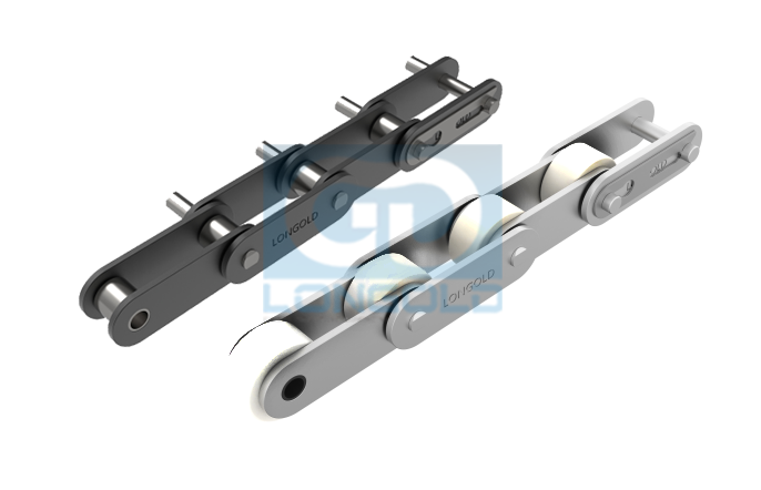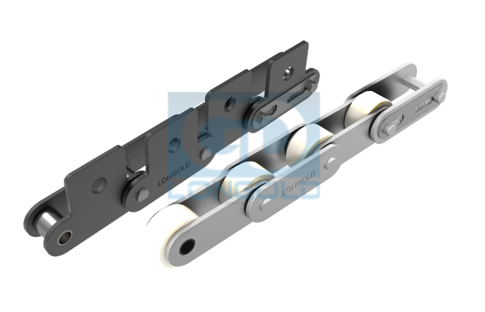 本體鏈條為雙倍節(jié)距輸送鏈,鏈條滾子為特殊工程塑料制R滾子,比普通工程塑料滾子噪音更低。本體鏈條可為普通規(guī)格,鍍鎳規(guī)格和SS不銹鋼規(guī)格。