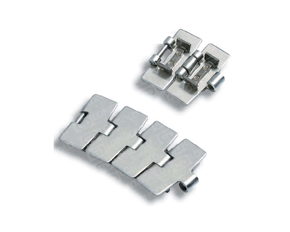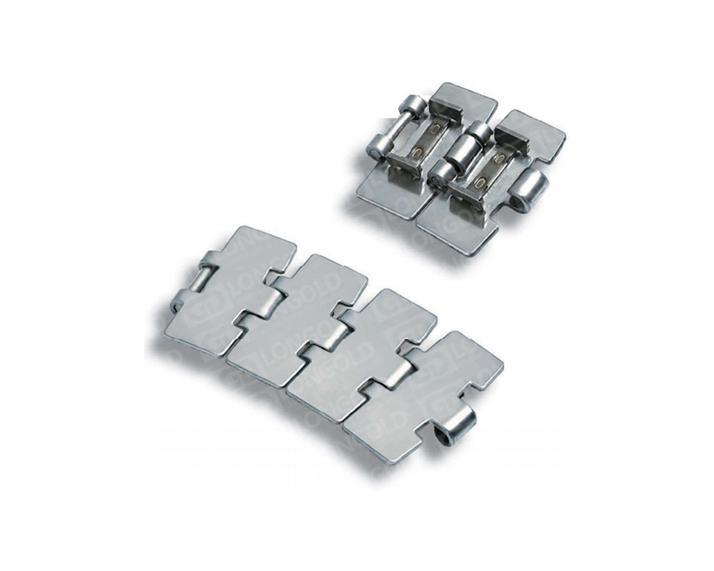 881T系列側(cè)彎鏈,鉸鏈為勾腳型(帶突舌),型號表示中用字母“T”表示。鏈片材質(zhì)為碳鋼時,銷軸材料為表面硬化鋼;鏈片材質(zhì)為不銹鋼時,銷軸材料為奧氏體不銹鋼。
