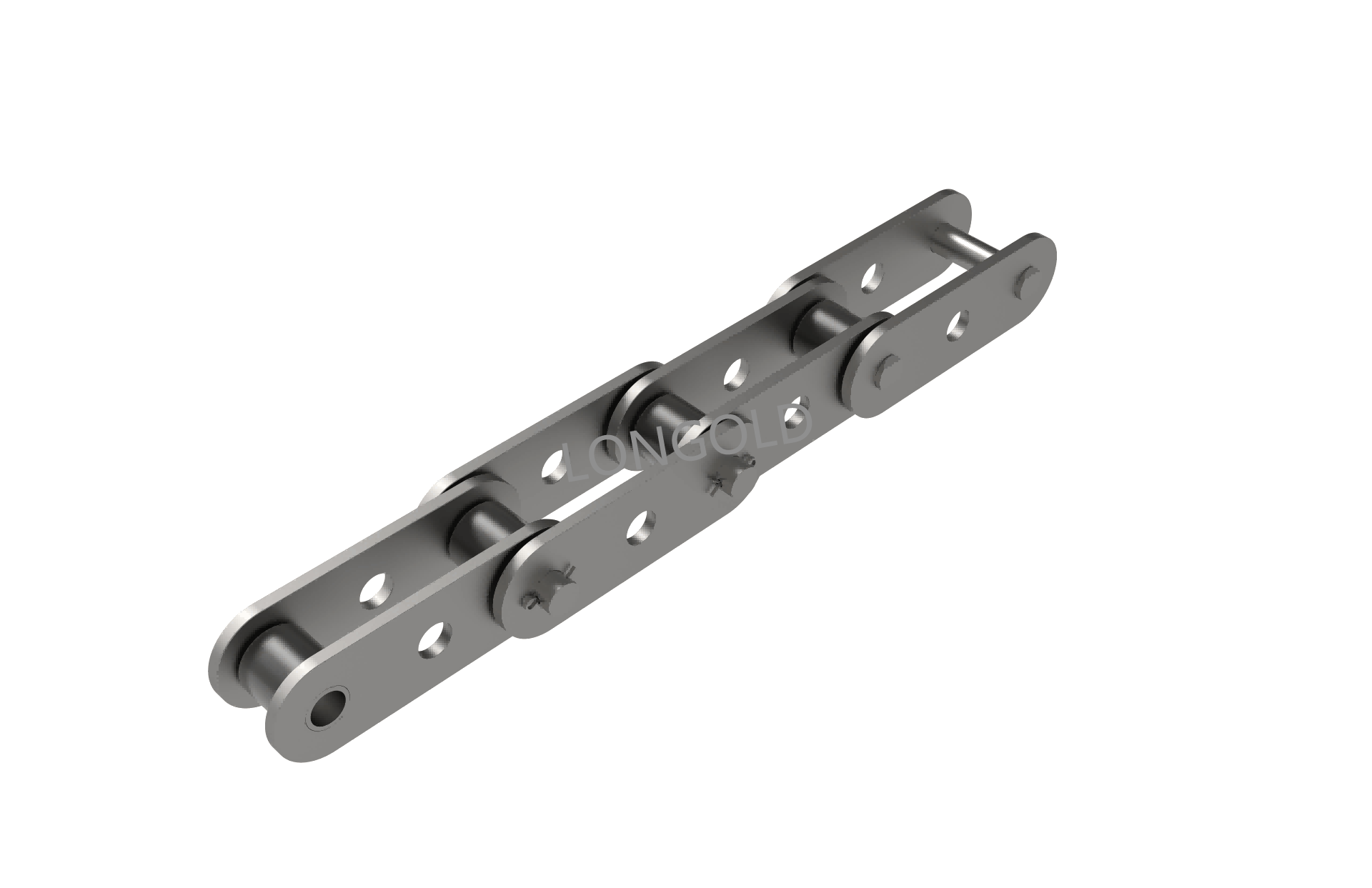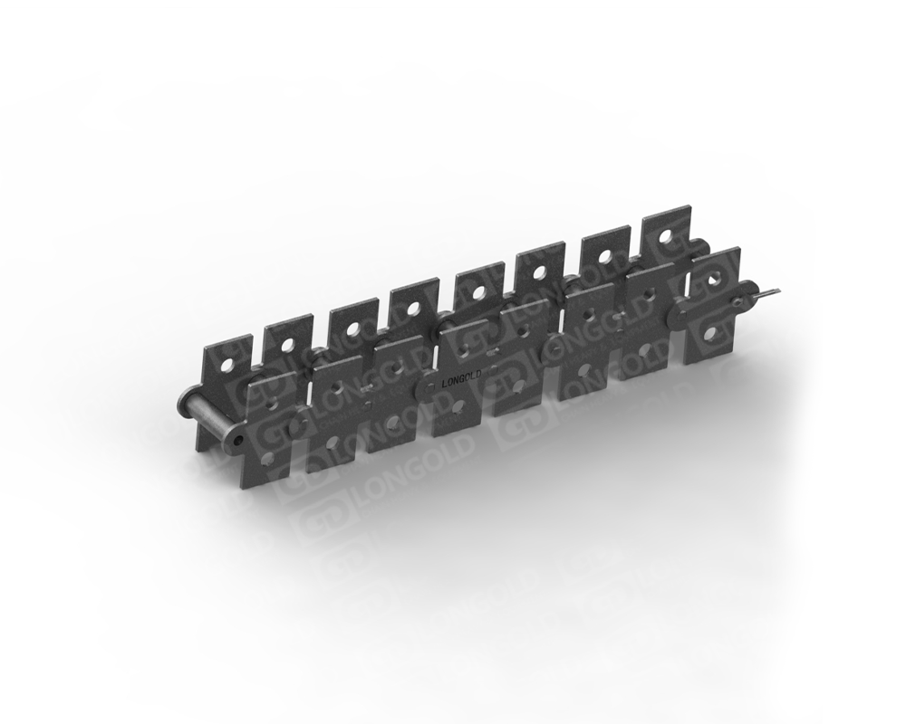 ANSI標準滾子鏈條的節(jié)距增加一倍,其他尺寸不變的鏈條。鏈條執(zhí)行ISO標準,鏈條單側(cè)鏈板向上下兩側(cè)延伸,且延伸的附板上帶有兩個孔。