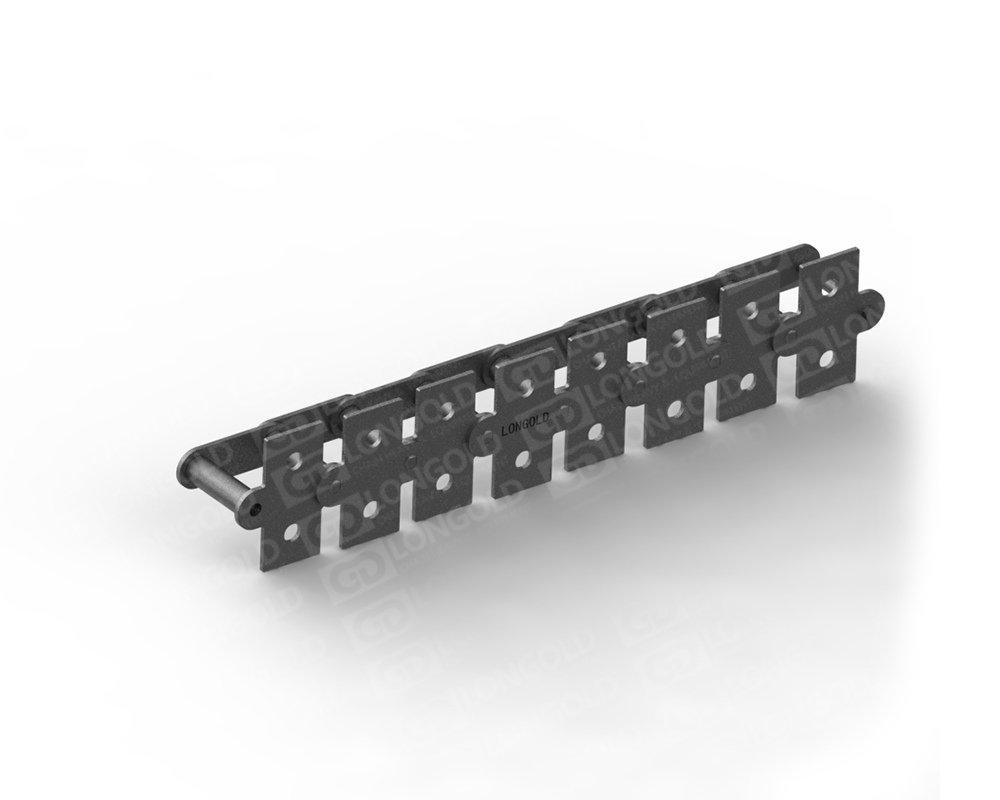 與短節(jié)距A系列滾?鏈條相?,鏈條節(jié)距增加1倍(稱為雙倍節(jié)距),鏈板形狀為直板形,鏈條的兩側(cè)帶有直立板附件,且附件上有兩個螺孔的形式。依照JIS,ISO和ASME標準。
