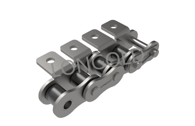 短節(jié)距標準滾子鏈(傳動用)型的鏈板上安裝了附件的鏈條。適用于短距離(通常10m以下)輸送,通常使用小節(jié)距鏈條輸送小型零部件。也適用于低噪音等環(huán)境。