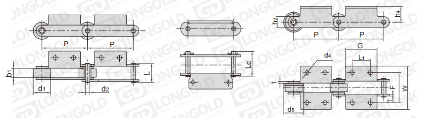 此種輸送鏈?zhǔn)怯呻p節(jié)距鏈條衍生而來的,鏈條節(jié)距為非常用規(guī)格,通過裝備標(biāo)準(zhǔn)附件或非標(biāo)附件使鏈條滿足特定的工作需求。