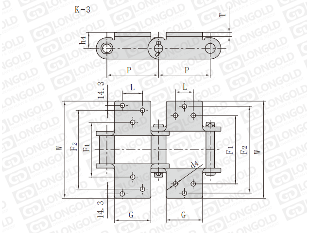 鏈條為套筒鏈,且?guī)3附件,即鏈條兩側(cè)的鏈板帶折彎板,折彎板上各帶三個(gè)孔。