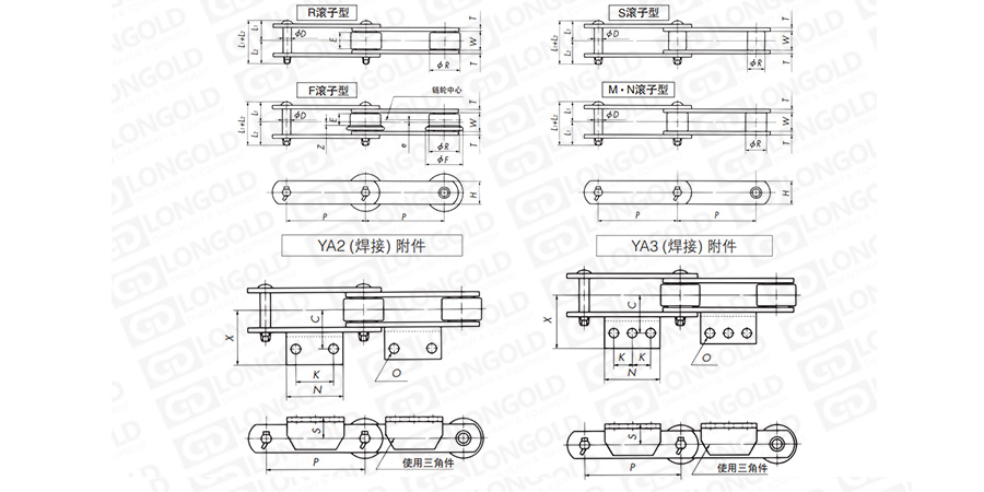 在大型輸送鏈條LDC36250~LDC440600的單側(cè)鏈板焊接附件的折彎板附件的鏈條。附件是為了將夾具安裝在鏈條上的零部件,可根據(jù)客戶要求設(shè)定安裝間隔。附件上帶有2個或3個孔,附件表示為:YA2、YA3。