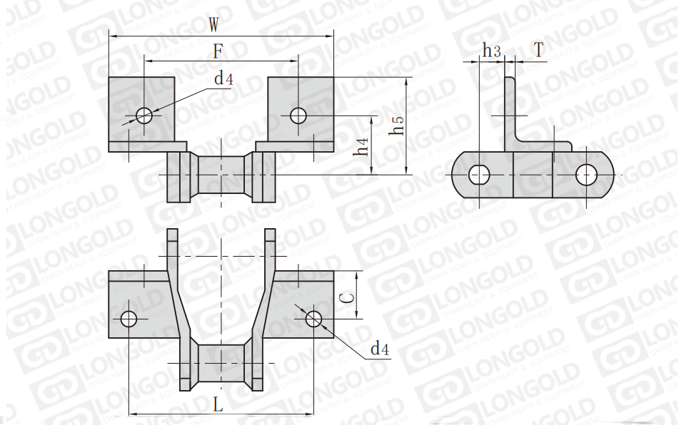 F4型附件:這些附件是帶有安裝孔的角鋼,安裝在鏈節(jié)兩側(cè)的鏈板彎部上。
