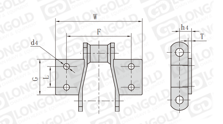 K2型附件:這些附件是帶有安裝孔的附件板,裝在鏈節(jié)兩側(cè)的鏈板彎部處,且與鏈節(jié)節(jié)距線平行。