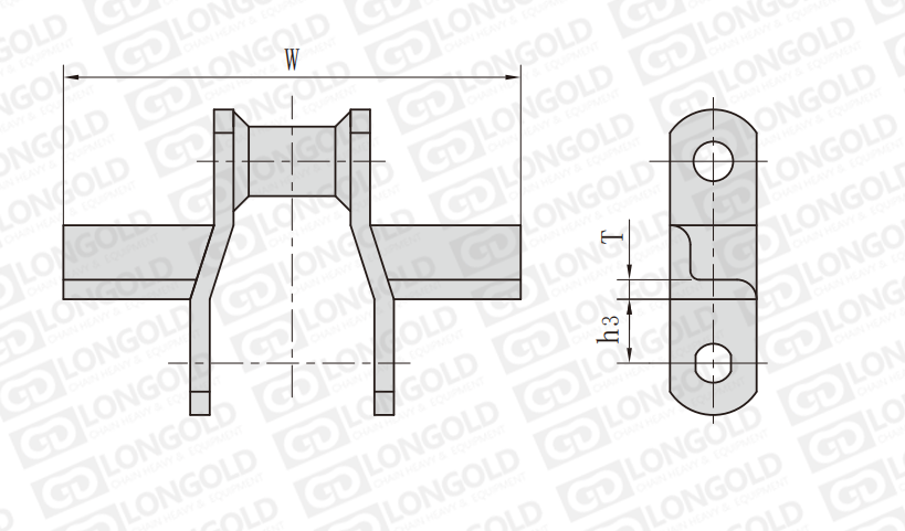 焊接結(jié)構(gòu)彎板鏈條是一種特殊結(jié)構(gòu)的鏈條,其鏈板采用彎板形式,并且通過焊接工藝將各個(gè)部件連接在一起。W1附件形式,即在鏈節(jié)的每塊彎鏈板的外側(cè)面上裝一角鋼。