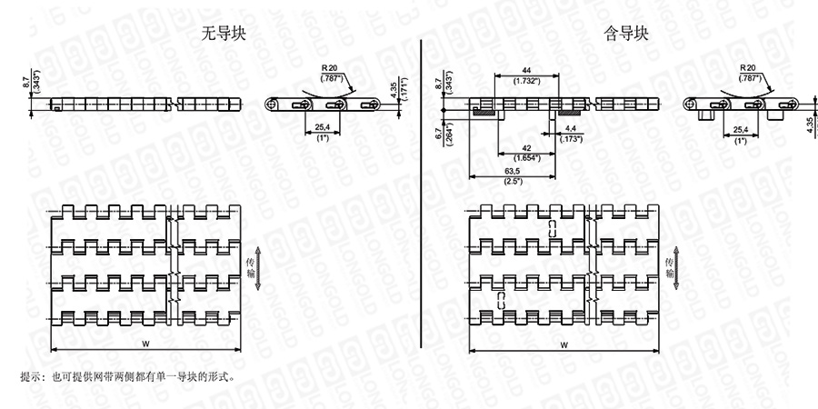 上圖為1"節(jié)距輕載網(wǎng)帶與鏈板 1600系列的結(jié)構(gòu)圖,圖紙中已標(biāo)明部分尺寸。