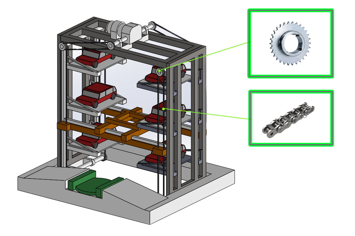 在立體停車場中,車輛通過載車板的升降和橫移進行存取。下層車位可直接存取車輛,上層車位需將下方車位橫移讓出空間后,通過升降裝置(鏈條和鏈輪作為主體)將車輛存入或取出。