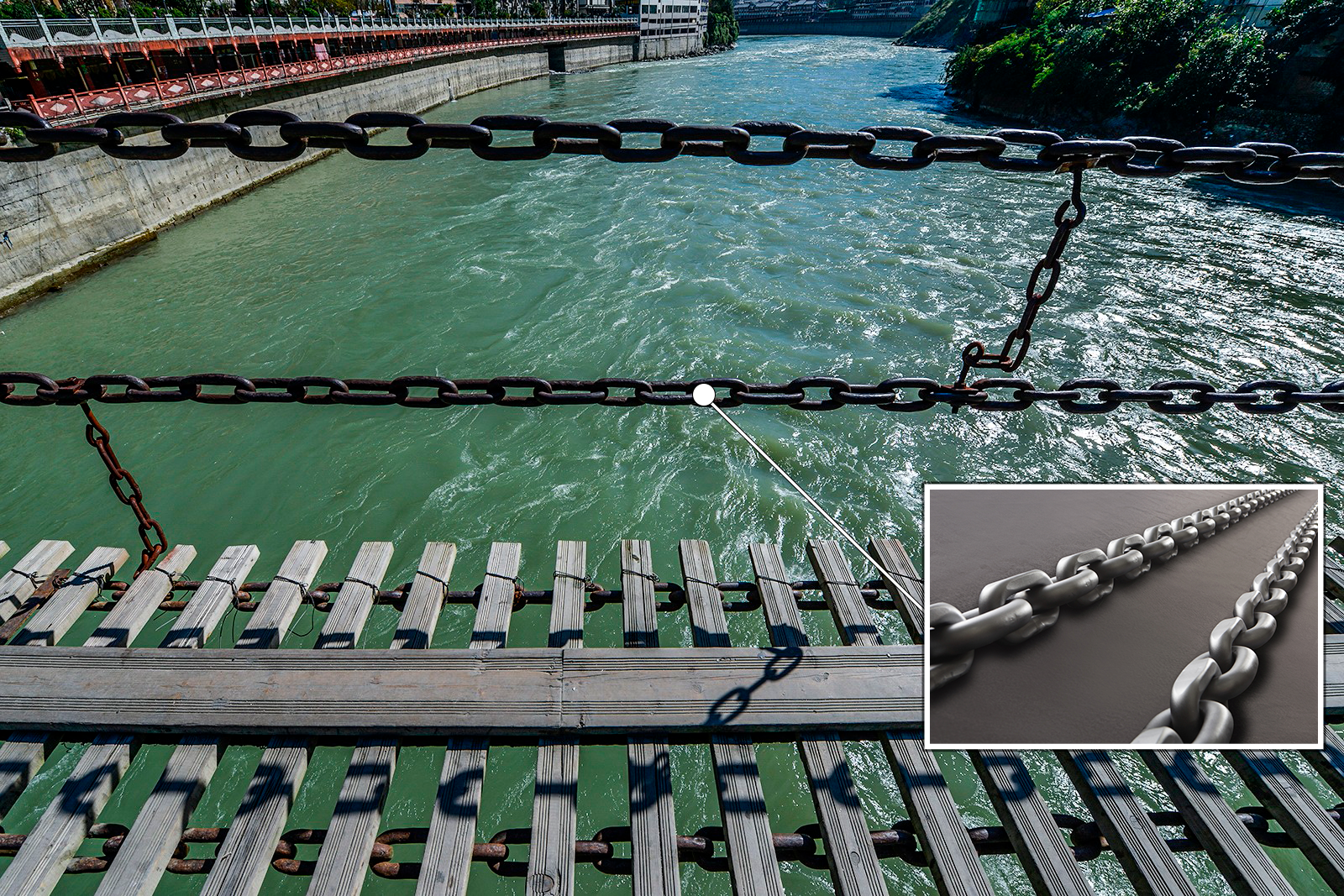 在山區(qū),由于地形復(fù)雜,道路建設(shè)難度大,鐵索橋便成為了一種重要的交通設(shè)施,除去能便利交通外,鐵索橋本身也具有一定的觀賞價值。 |