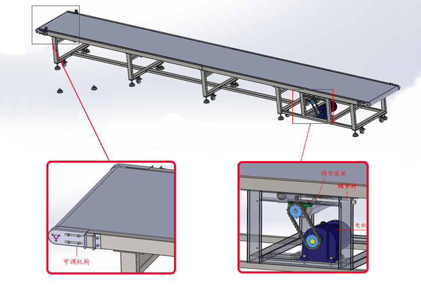 皮帶輸送機(jī)將電機(jī)轉(zhuǎn)動的動力通過傳動裝置(傳動鏈和鏈輪)帶動輸送帶在滾筒之間轉(zhuǎn)動,從而對將物品從一端輸送到另外一端。
