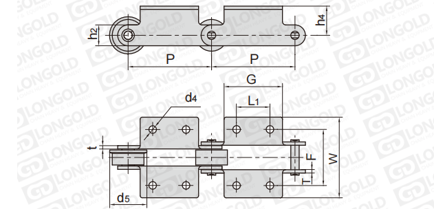 此種輸送鏈?zhǔn)怯呻p節(jié)距鏈條衍生而來(lái)的,鏈條節(jié)距為非常用規(guī)格,通過(guò)裝備標(biāo)準(zhǔn)附件或非標(biāo)附件使鏈條滿足特定的工作需求。