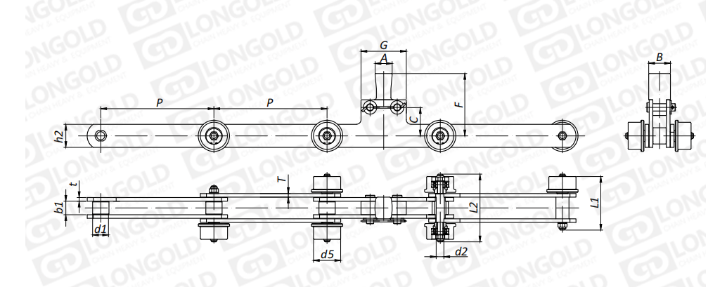 鏈條帶側(cè)置滾輪,以三個(gè)鏈節(jié)為規(guī)律,中間鏈節(jié)帶雙側(cè)滾輪,且鏈板帶特殊附板,前后鏈節(jié)帶單側(cè)帶不同邊滾輪,鏈板形狀同本體鏈條。