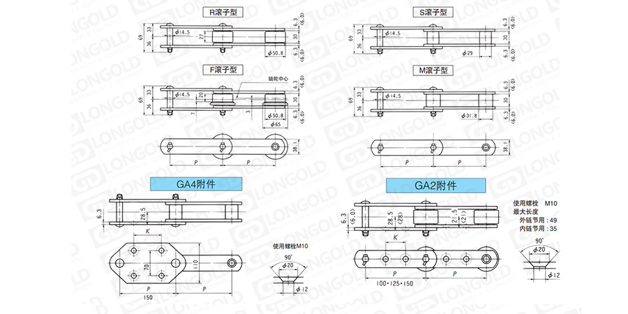 在10100~10150米制節(jié)距大型輸送鏈條的單側(cè)特殊形狀和開孔的鏈條。附件是為了將夾具安裝在鏈條上的零部件,可根據(jù)客戶要求設(shè)定安裝間隔。單側(cè)鏈板上帶有螺孔,附件表示為:GA2、GA4。