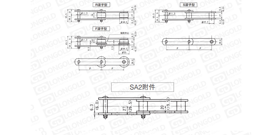 上圖為帶SA2附件LDC08125~LDC08150規(guī)格輸送鏈的結(jié)構(gòu)圖以及帶附件結(jié)構(gòu)圖。