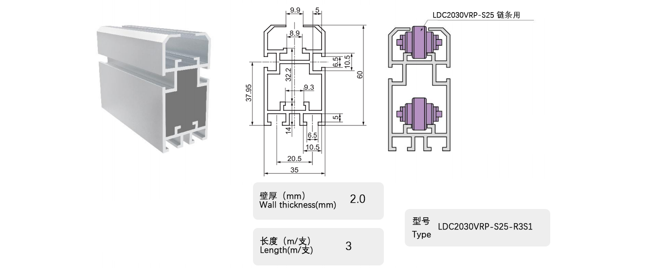 在鋁制框架的輸送側(cè)小直徑滾子部安裝有鋼軌,可用于所有倍速鏈條。