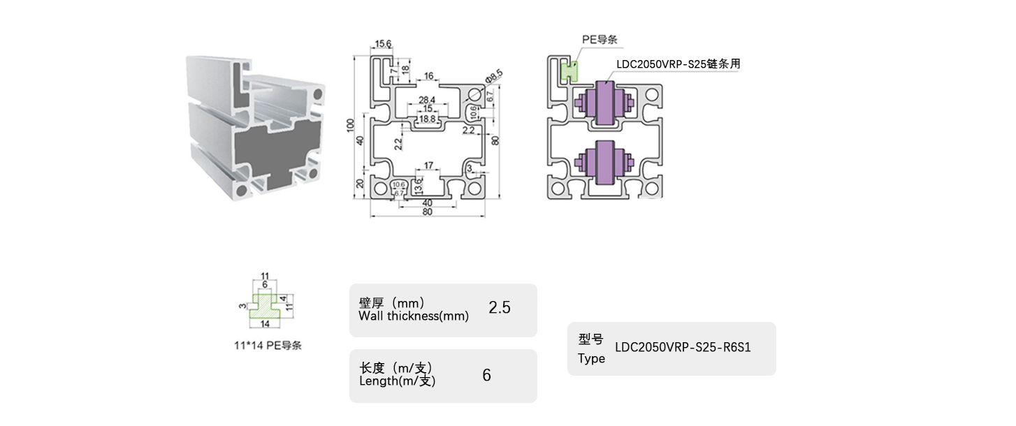 倍速鏈條用鋁制框架,用于滾子部采用工程塑料的倍速鏈條,包括帶蓋罩的倍速鏈條。在鋁制框架的輸送側(cè)小直徑滾子部安裝有鋼軌,可用于所有倍速鏈條。