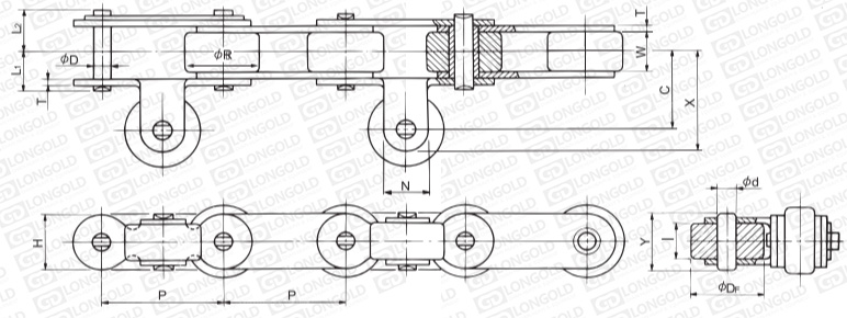 上圖為帶導向滑輪雙倍節(jié)距鏈結構圖。