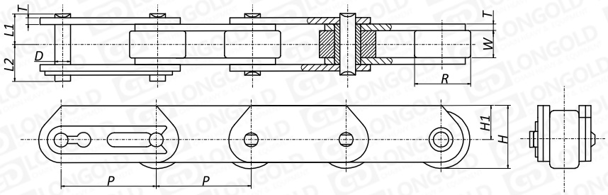 上圖為R滾子鏈雙倍節(jié)距鏈帶附件圖,S滾子型的附件尺寸也與其相同。